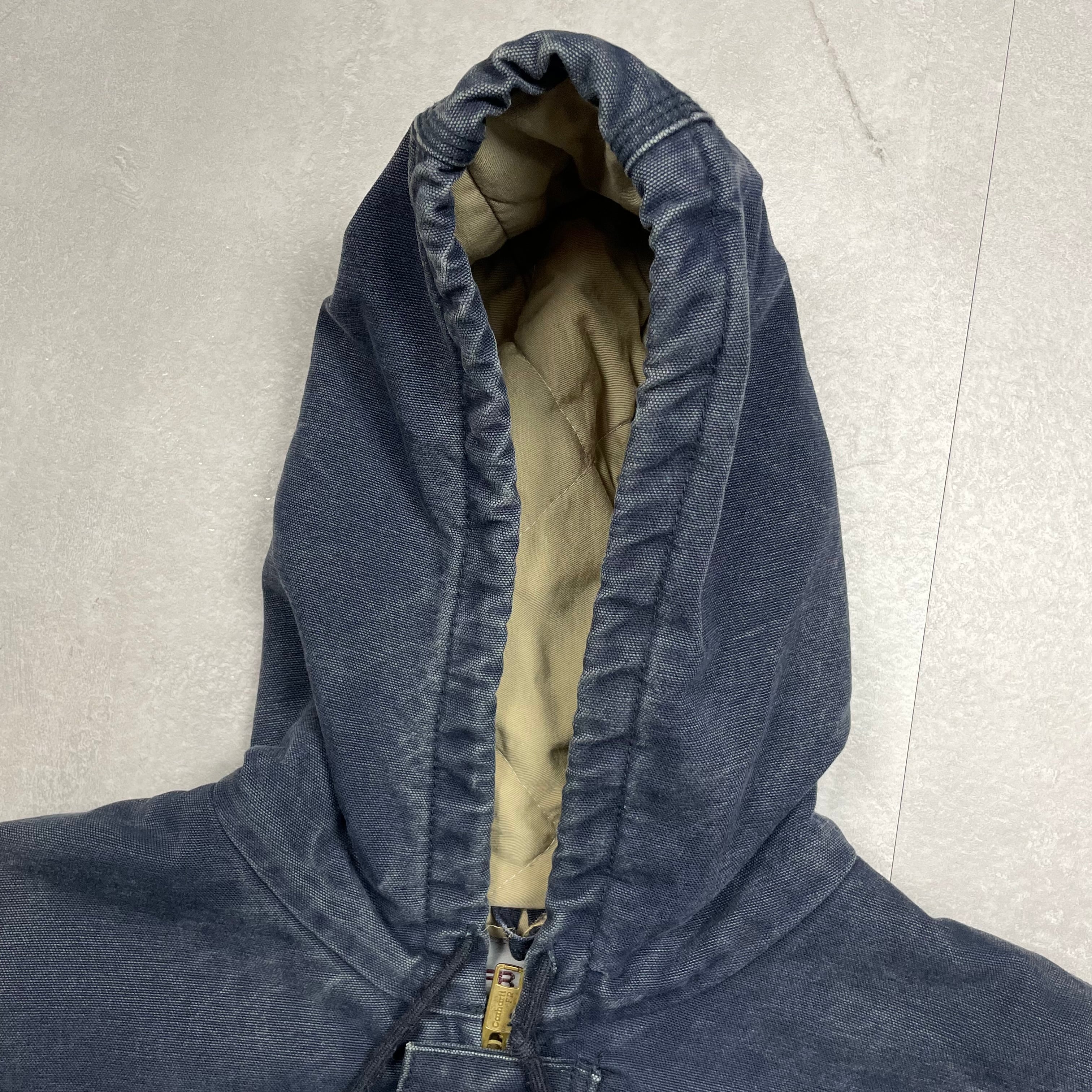 《L》Carhartt カーハート アクティブジャケット ダックジャケット ダークネイビー フェード 刺繍企業ロゴ パッチロゴ フェード ダメージ no.9792