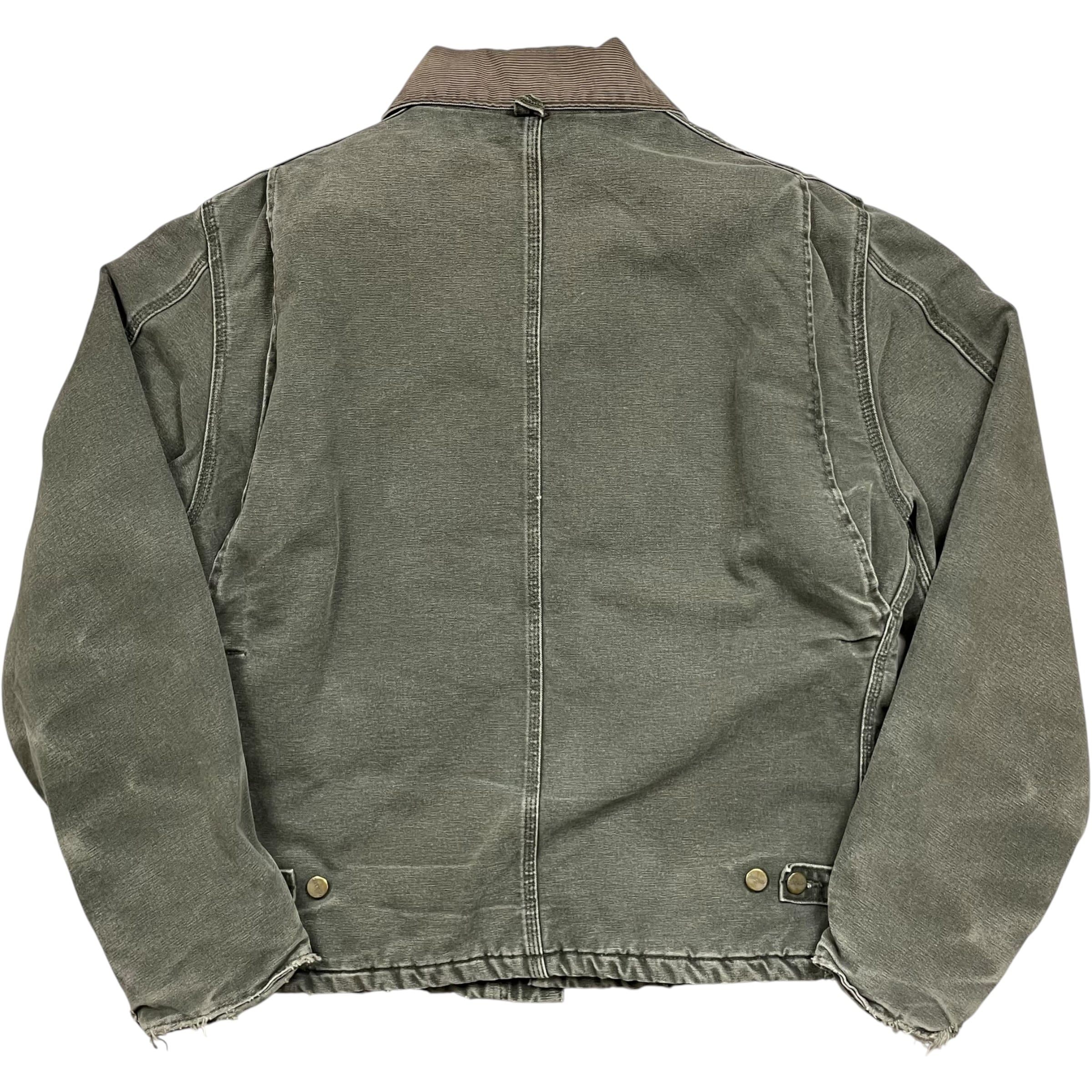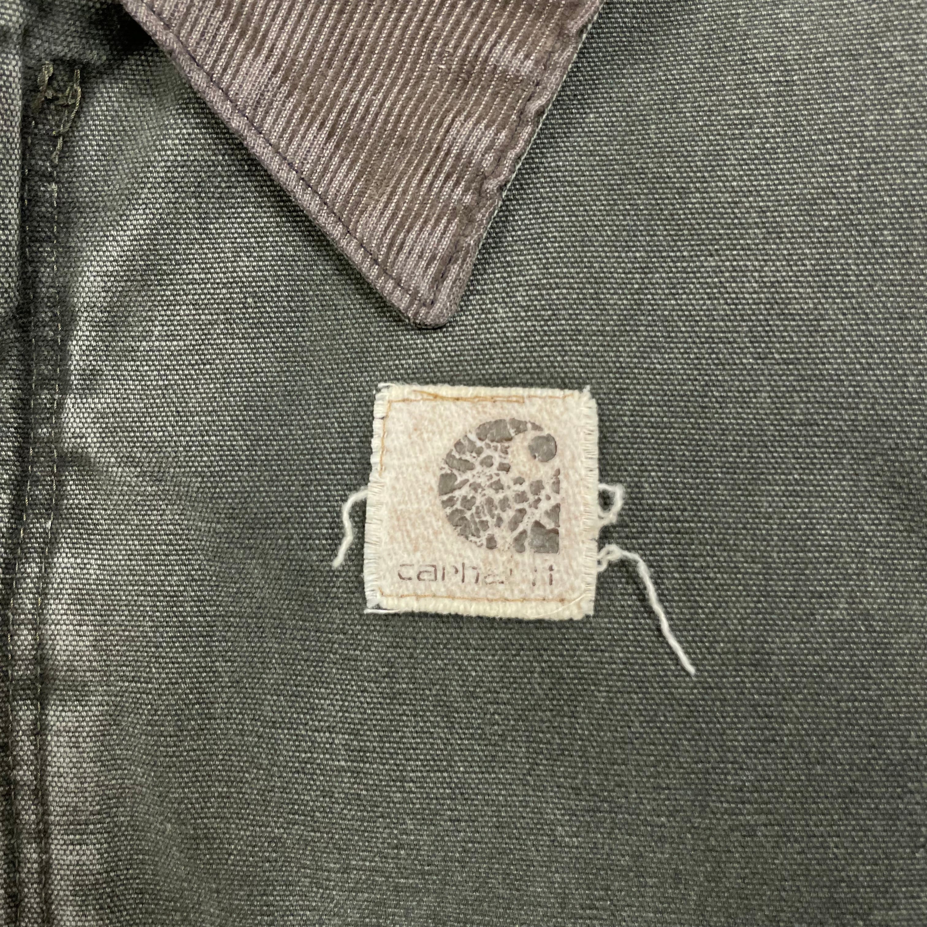 《L》Carhartt カーハート トラディショナルコート ダックジャケット モスグリーン 希少モデル 短丈 ワンポイントロゴ フェード ダメージ ハチノス 襟コーデュロイ USA製 no.9793