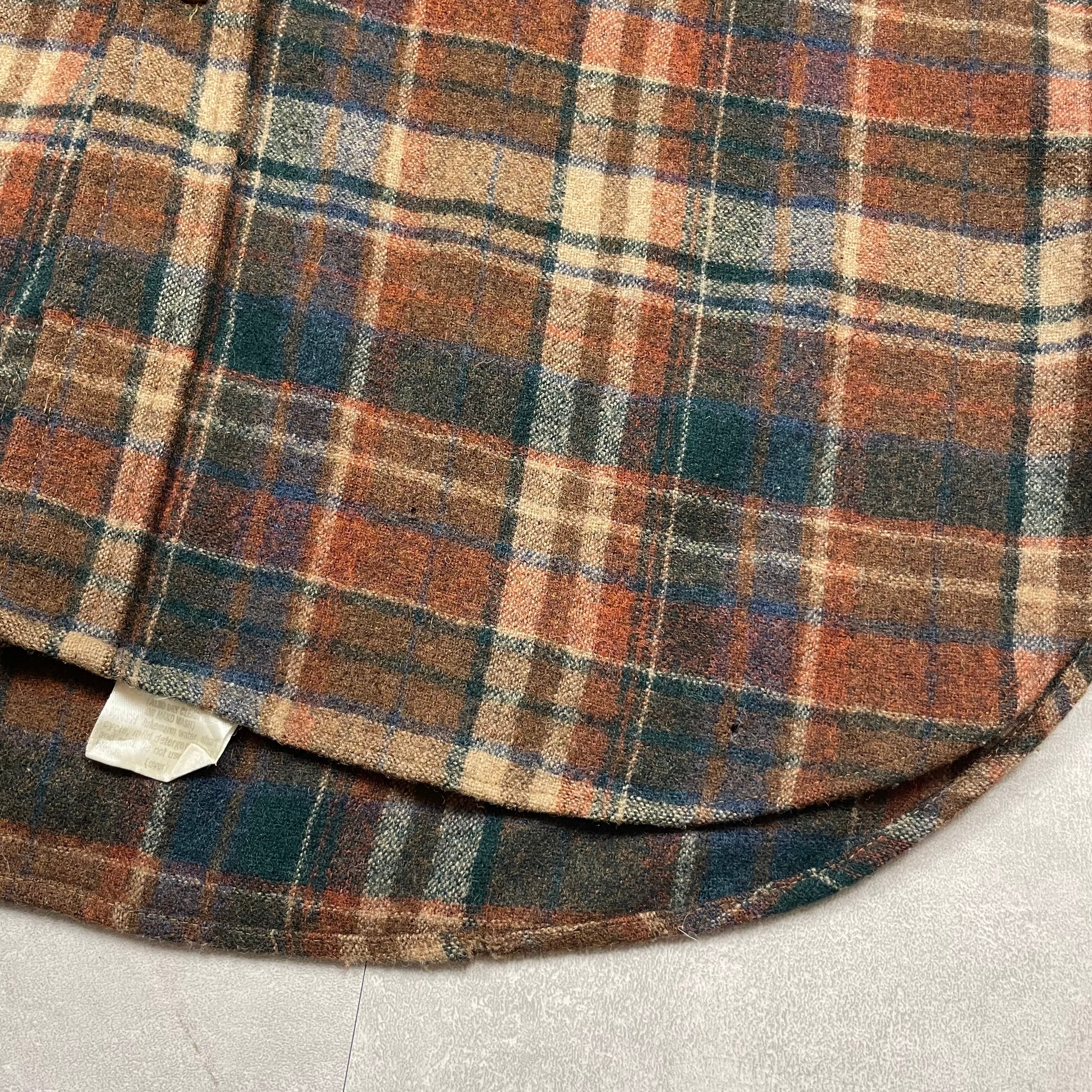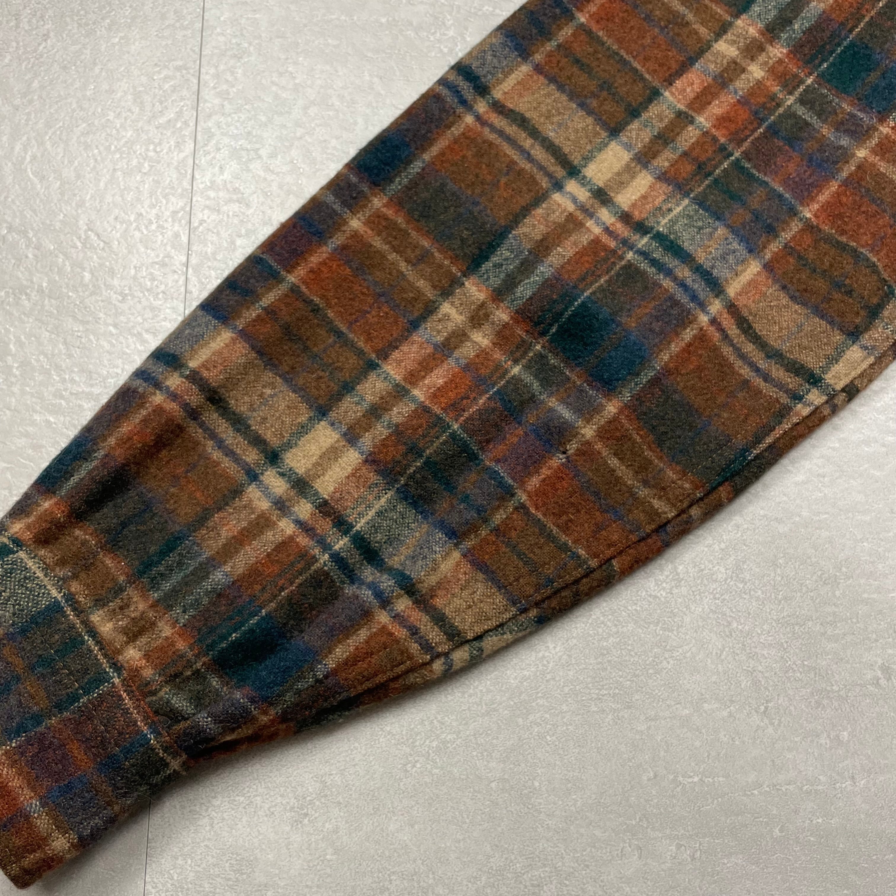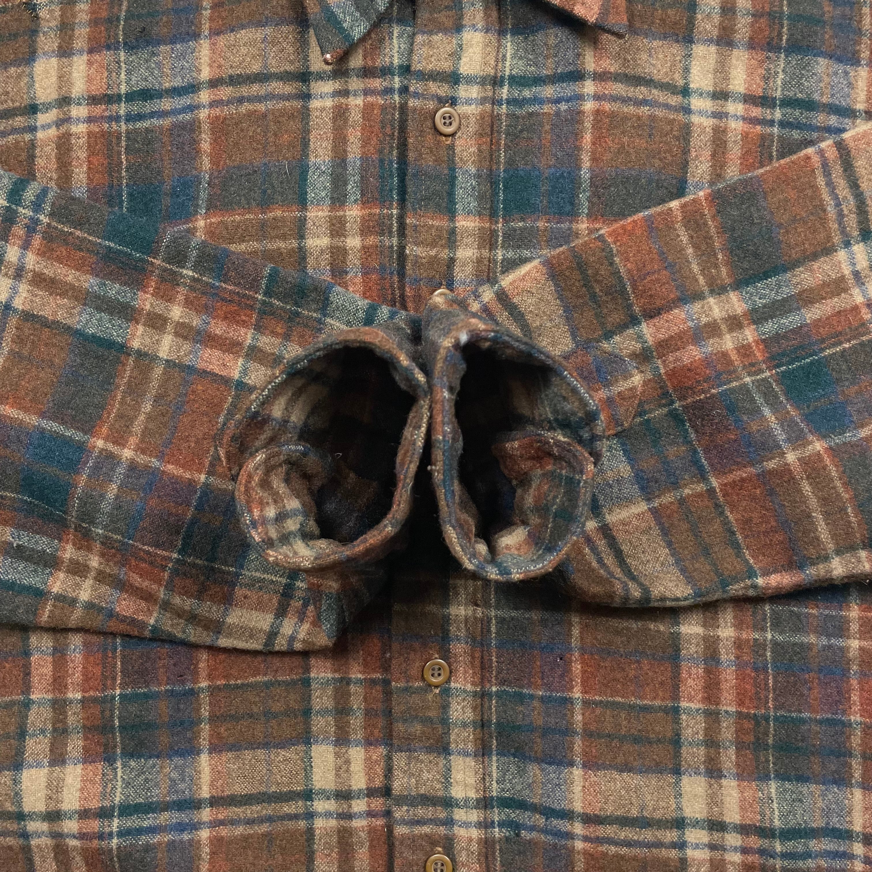 《L》 PENDLETON ペンドルトン チェック柄 ウールシャツ 数箇所穴あり ブラウン×ブルー×バーガンディ USA製 70年代 vintage no.9969